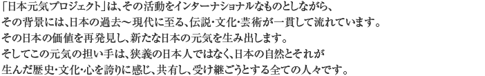 自然に対し畏敬の念を表す世界に類を見ないほどの多彩な「祭」や、日本が世界に誇るエンターテインメント「歌舞伎」「能」等の文化や芸術性が根底に流れます。